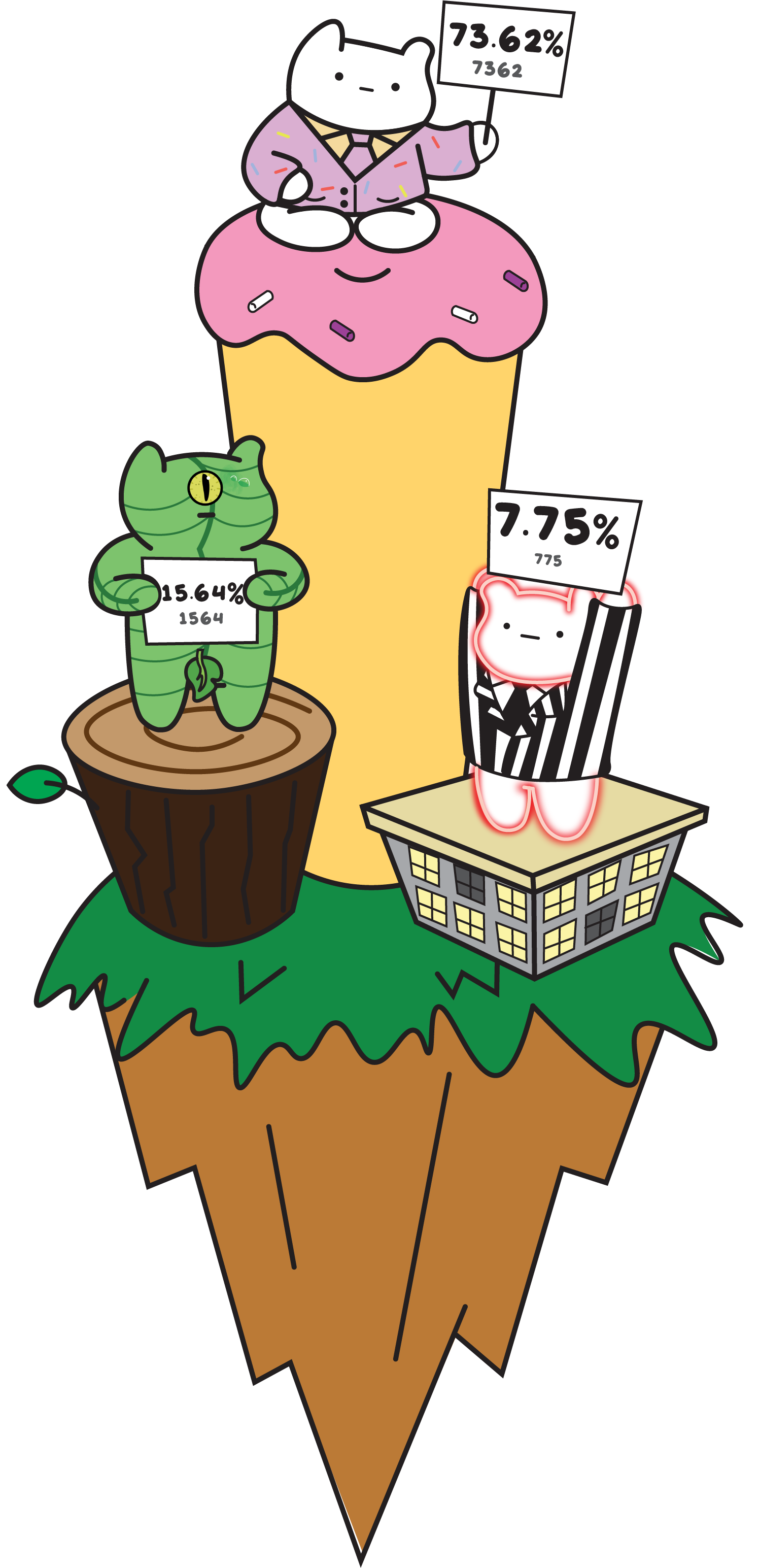 A toasty atmosphere with rugged terrain, Donut World is a vast expanse covered by purple frosting and candied bushes. Large stone statues of a cute creature adorn the sides of a winding road. As the road melts into the horizon, a range of sugar-capped mountains dominate the landscape. An enormous waterfall sits at the center of the world, with water flowing straight through the surface and into space. There is no sign of life in sight.